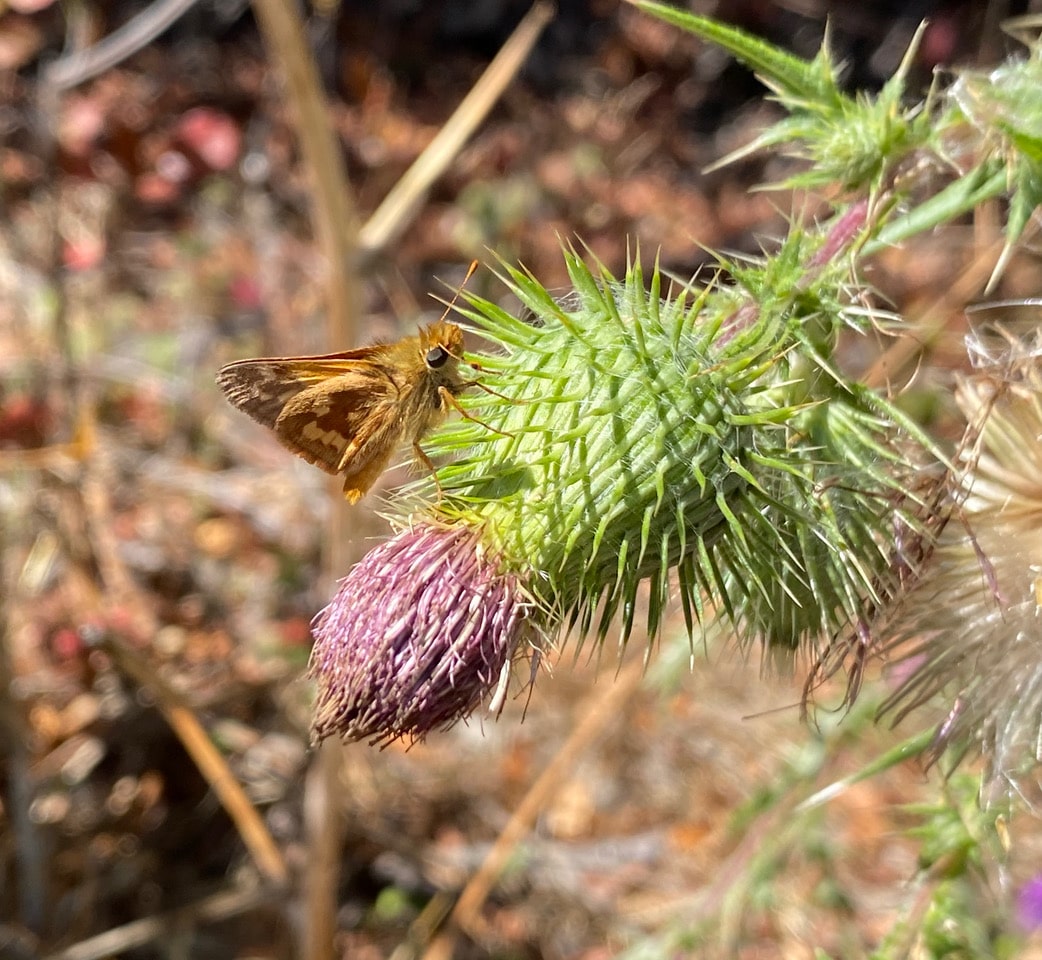 As I pass the same Bull Thistles near the Steam Train entrance a couple of hours later, insect activity seems to have intensified with the rising temperatures. A Skipper butterfly takes a break on an involucre of a spent Bull Thistle flowerhead.