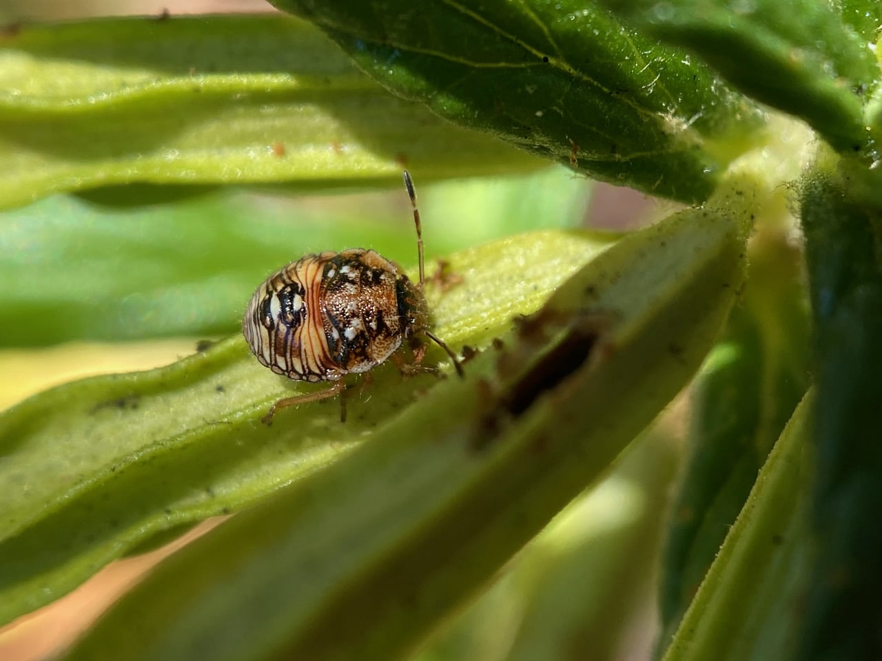 The intricate and colorful patterns on the nymph’s back remind me of a piece of cloisonné jewelry. The creature is a late instar of the Red-shouldered Stink Bug, Thyanta custator (family Pentatomidae).