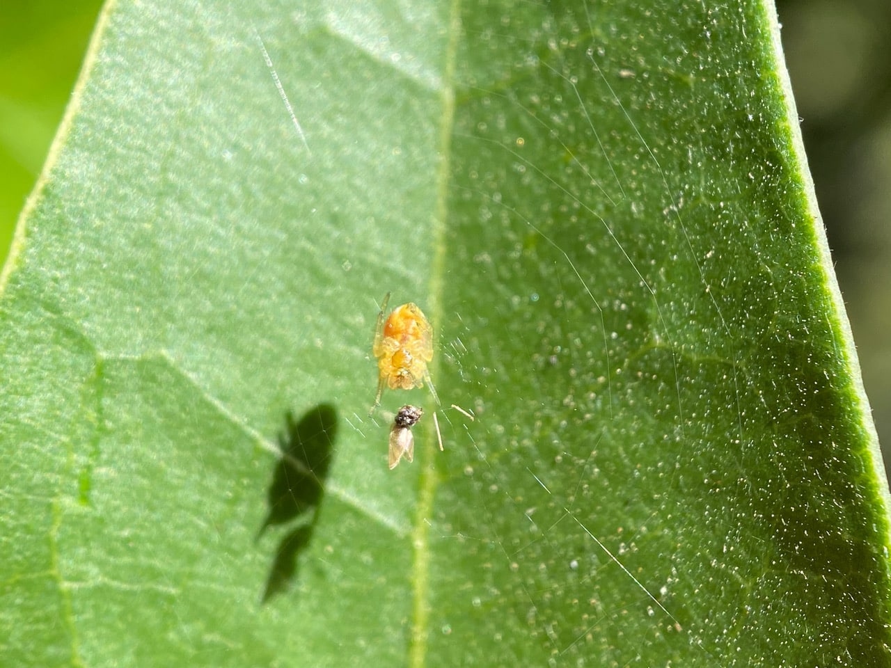 Against the backdrop of a California Bay leaf, a pale yellow spider, barely 3 mm long, has wrapped up a insect prey in silk in the middle of its orb web. We are looking at the spider’s underside, head pointing downward. A mere baby, it already knows its trade.