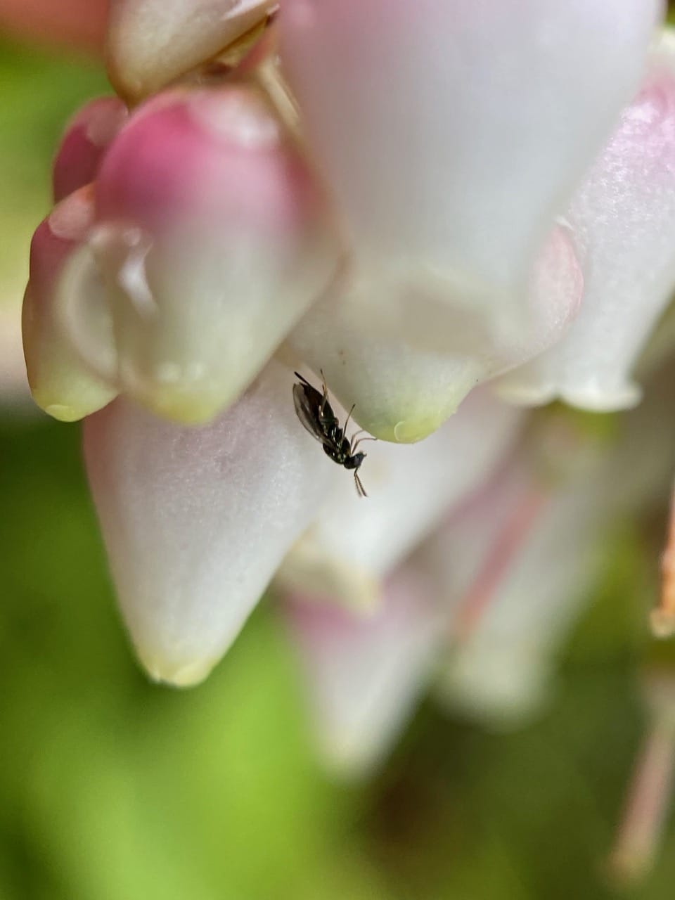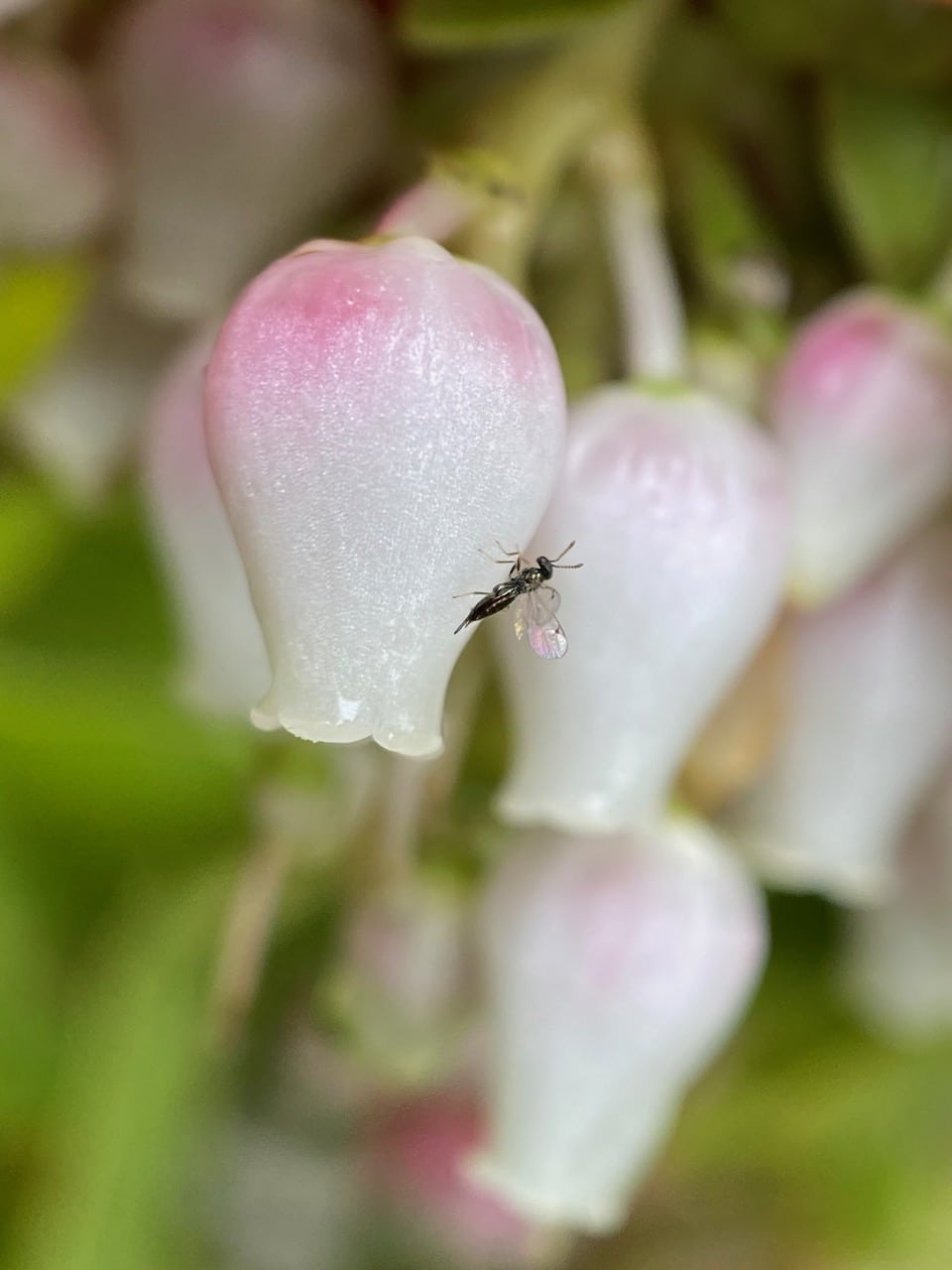A tiny parasitoid wasp is perched on a manzanita flower. iNaturalist has identified it as a member of the family Pirenidae (superfamily Chalcidoidea).
