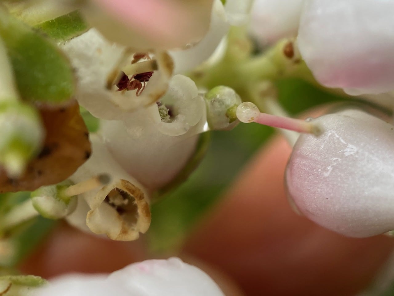 Pollen grains seem to be sticking to the stigma and hairs of these manzanita flowers. Did this result from a bee buzz-pollinating the flowers? How, then, does a manzanita flower prevent self-pollination? Perhaps the male and female reproductive structures mature at different times – dichogamy?