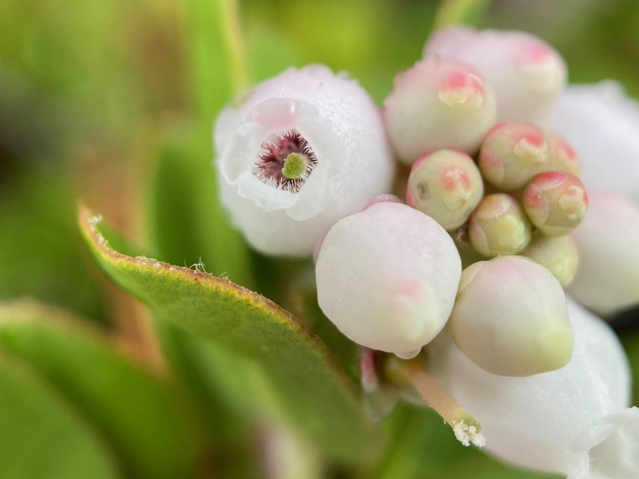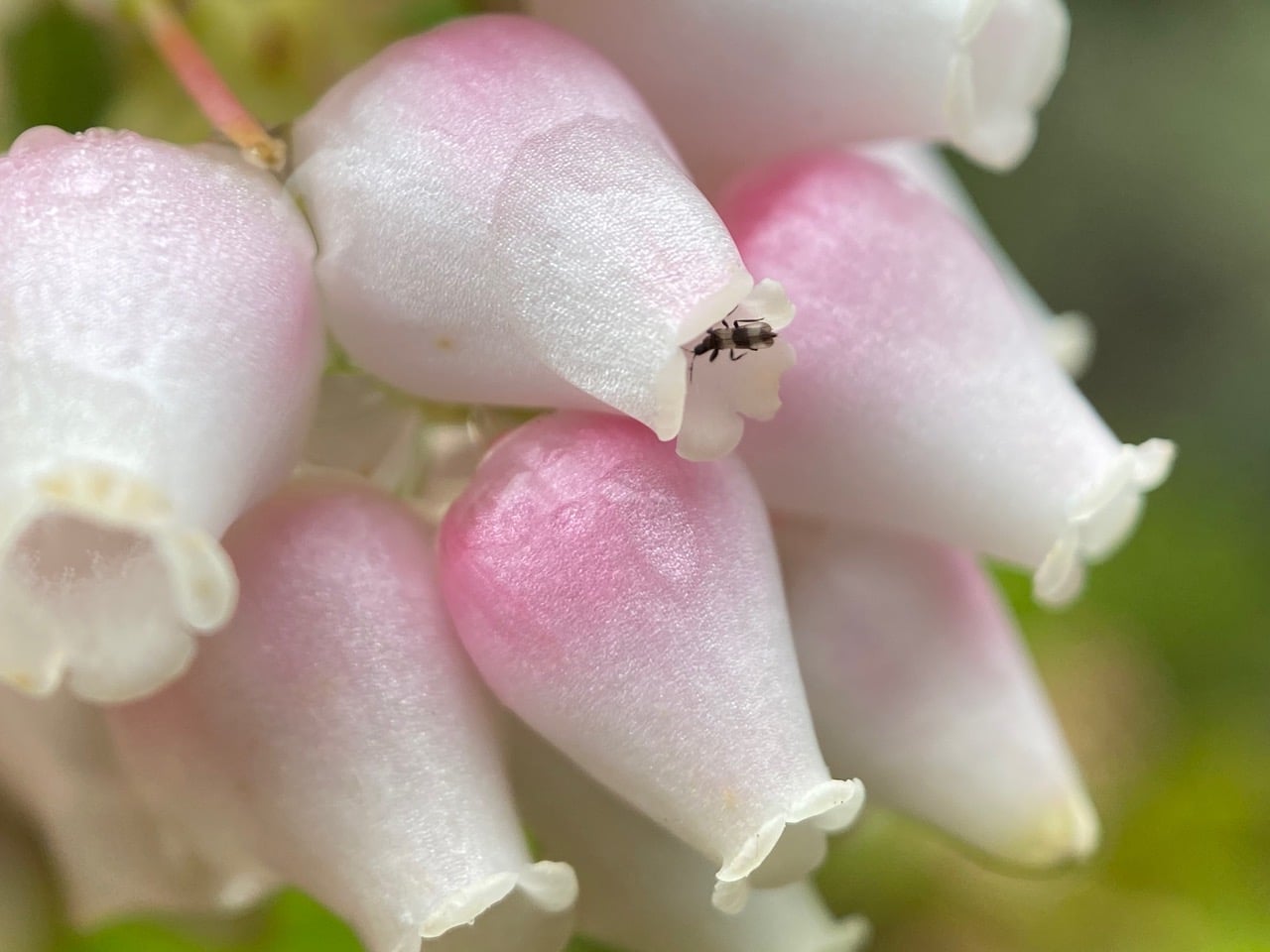 The manzanita flower is made up of fused petals that form an urn-shaped corolla, with a slightly flared opening. The flowers are usually small, white or tinged with pink, held upside-down and clustered together on the tips of branches, giving a showy display when blooming. The inverted urn-shaped corolla serves to protect the reproductive structures within through the rainy winter when the plant starts to bloom. The flowers are usually pollinated by bees shaking the pollen out through the tiny openings by sonication.