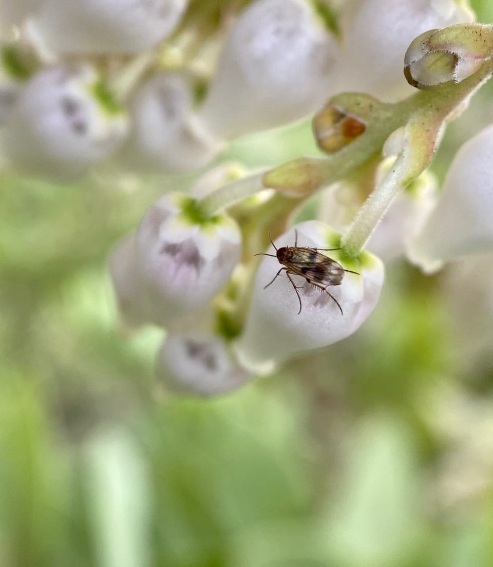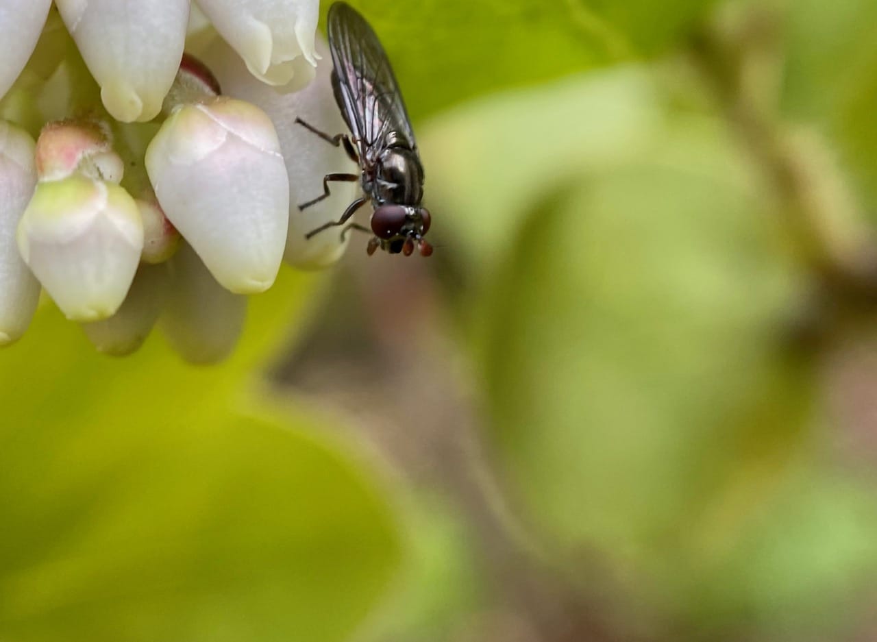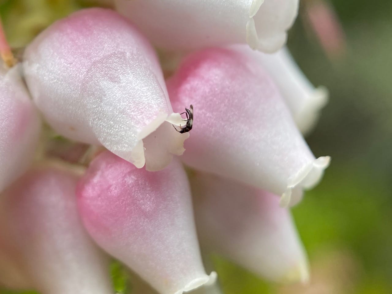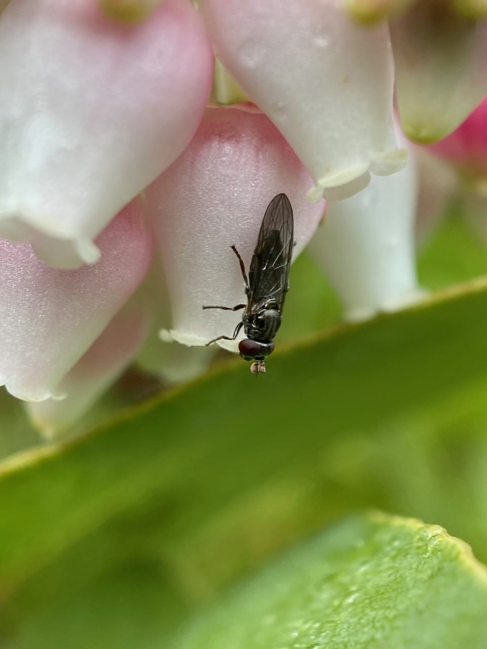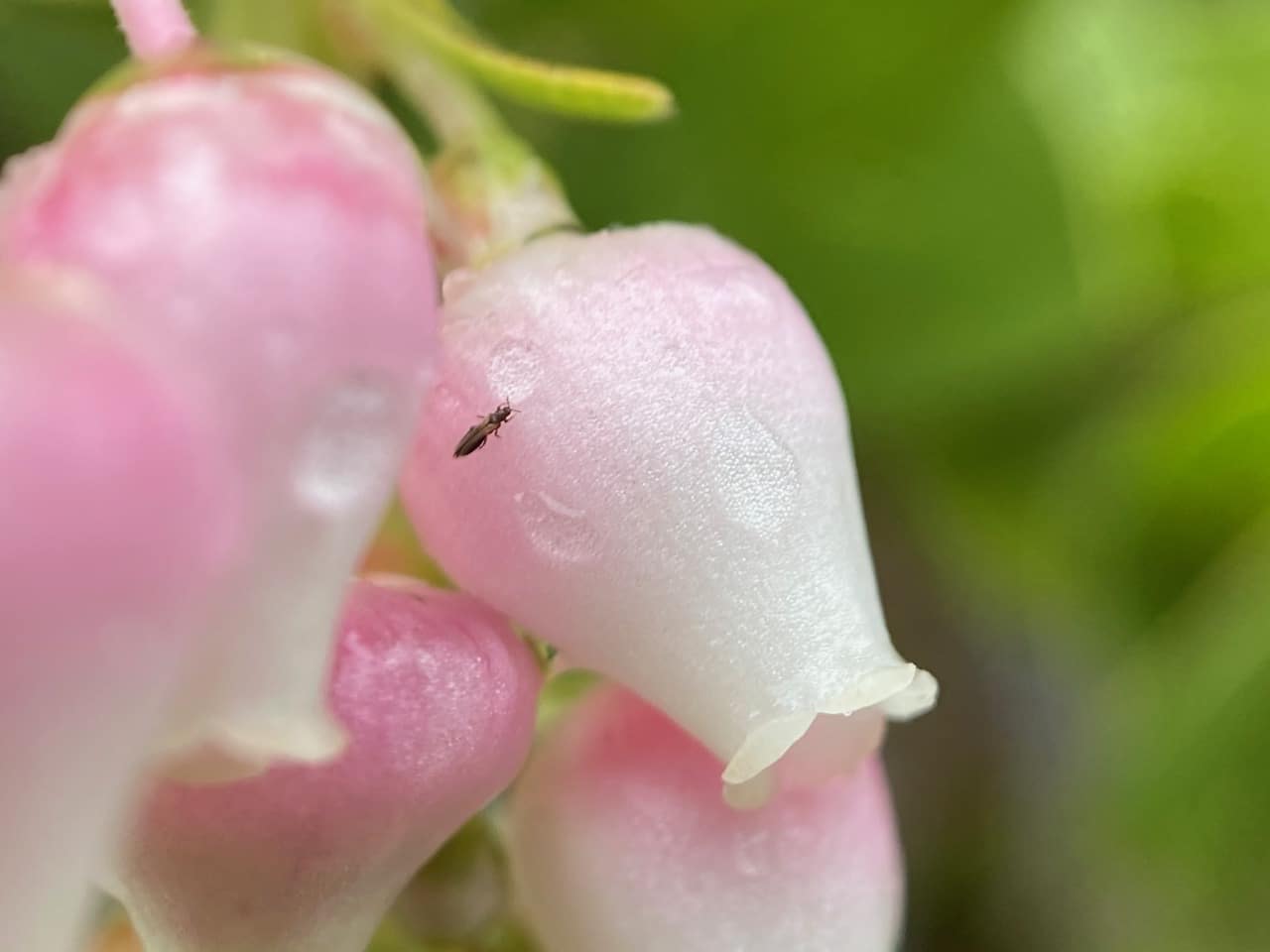 Barely visible to the naked eye a Thrips is perched next to a rain drop on a manzanita flower. An entomologist on iNaturalist has helped identify the thrips to the suborder Terebrantia, consisting of herbivorous thrips.