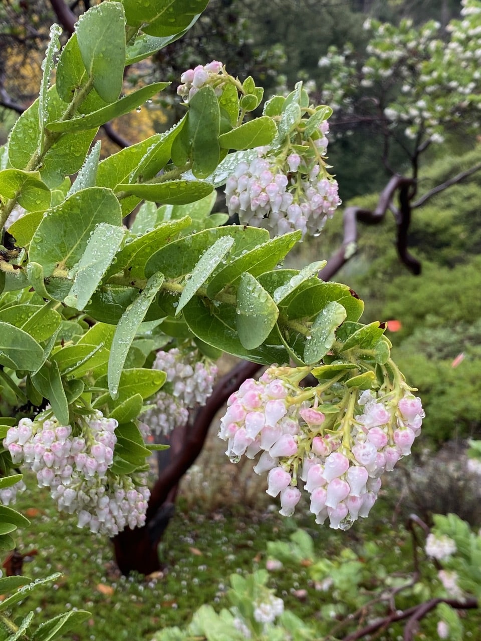 The East Bay Regional Parks Botanic Gardens in the hills of Berkeley is home to a wide variety of Manzanita, Arctostaphylos sp. (family Ericaceae). I am delighted that many of the hardy evergreen shrubs are already in full bloom on this cold but sunny morning.