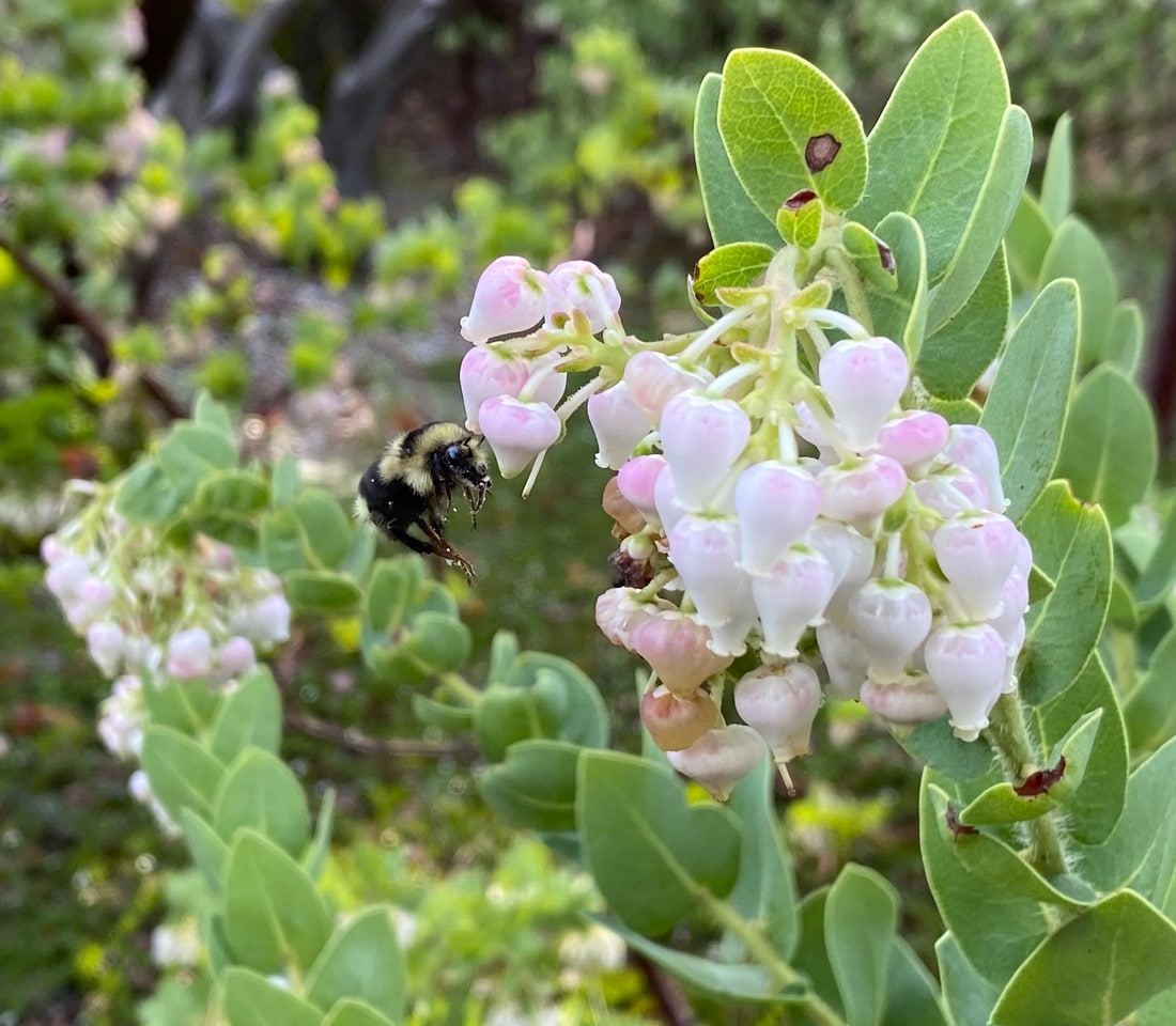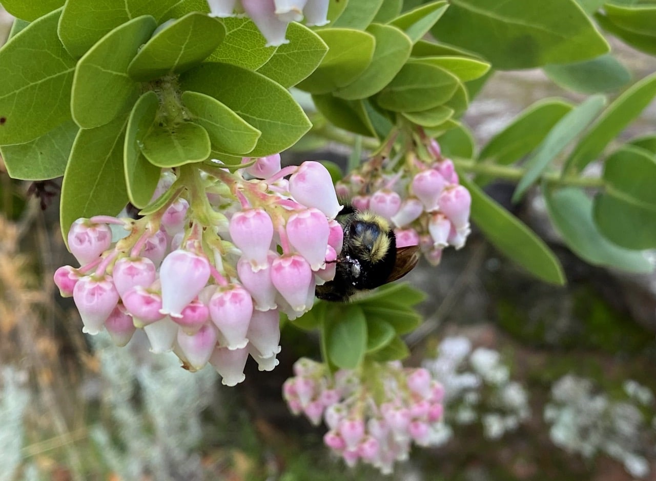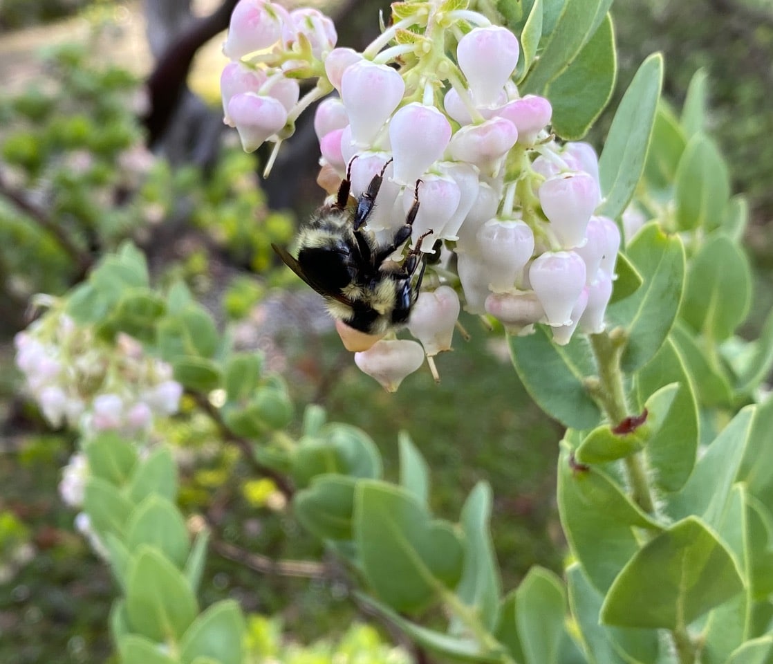 To collect pollen, bumble bees perform sonication or “buzz pollination”. Hanging upside-down on the manzanita flower, they disengage their wings from the flight muscles; then the muscles are vibrated at a specific high frequency to cause the pollen to shake loose and to fall down onto the bee’s belly. The bee gathers the pollen into the pollen baskets on her hind legs before returning to her hive.