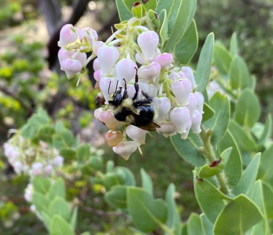 Hanging upside-down, a Black-tailed Bumble Bee, Bombus melanopygus (family Apidae) is foraging on a cluster of Manzanita flowers. The pollen baskets (corbiculae) on her hind legs are empty, so the bee is not collecting pollen. She is quietly taking nectar. I am not hearing the high-pitched buzzing sounds that bumble bees emit while buzz pollinating.