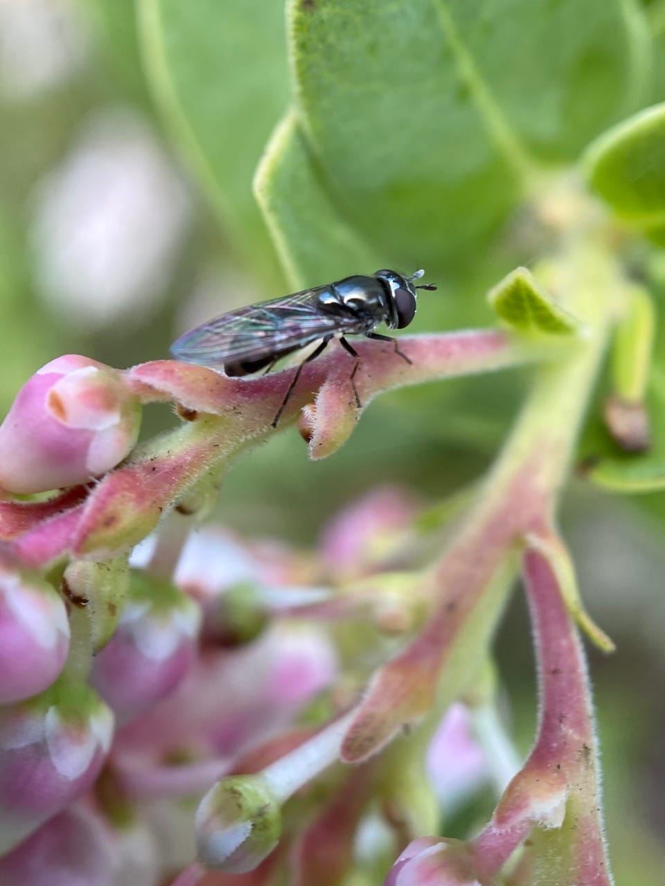 A dusky hover fly with a metallic sheen has landed on a cluster of Manzanita flowers. iNaturalist has identified it as a Bighorn Fly, Pelecocera sp. (family Syrphidae). The common name obviously refers to the large, greatly expanded paddle-shaped aristate antennae. The genus Pelecocera consists of small, narrowly-built hoverflies superficially resembling Platycheirus or Melanotstoma species in the field but of unclear affinity. Larva is undescribed, but apparently phytophagous. Yay, a new species of hover fly for me!
