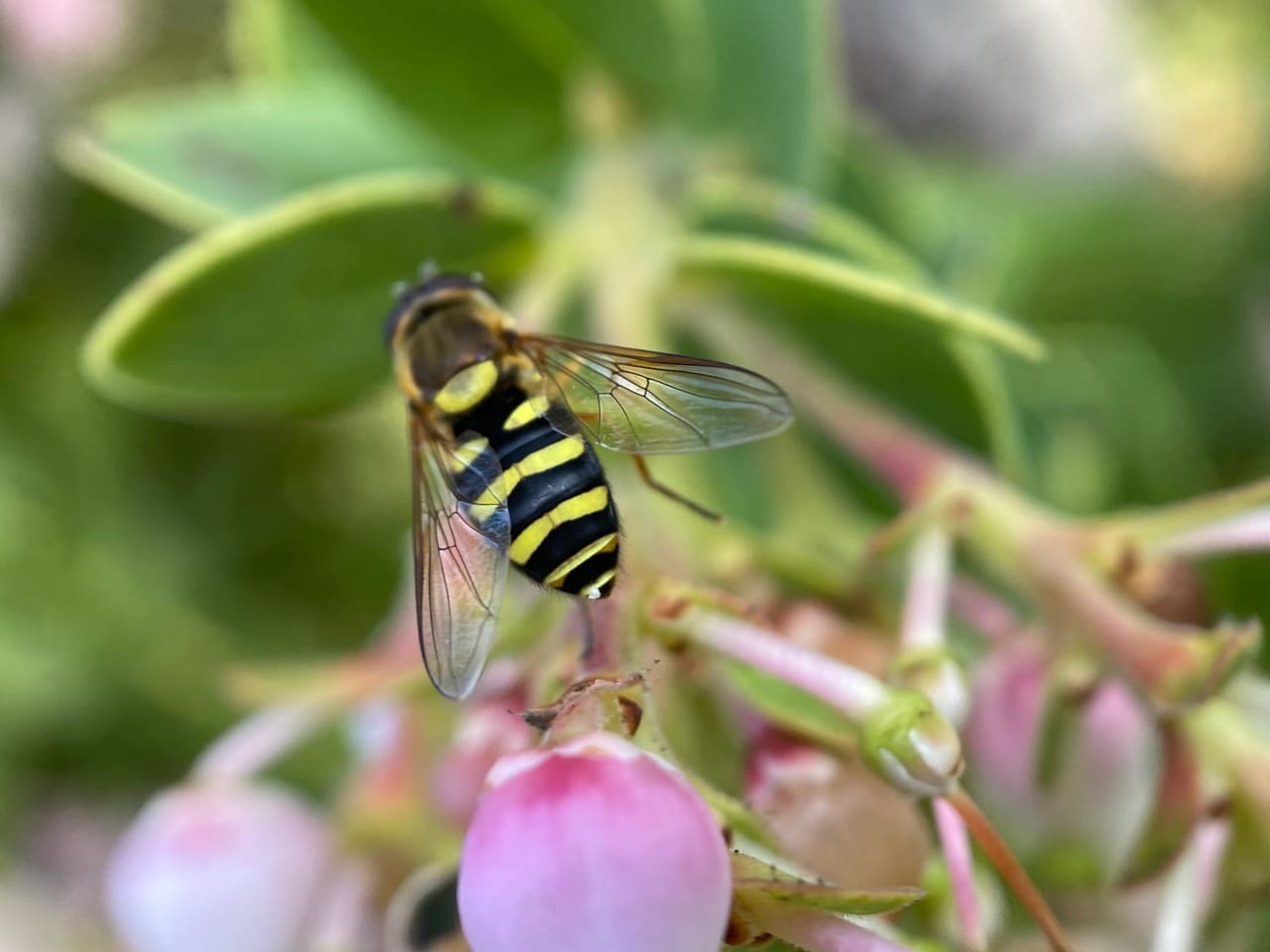 Hey, there’s another thrips on another manzanita flower! It is slightly larger, and has black-and-white banded wings. It is an Aeolothrips Predatory Thrips.