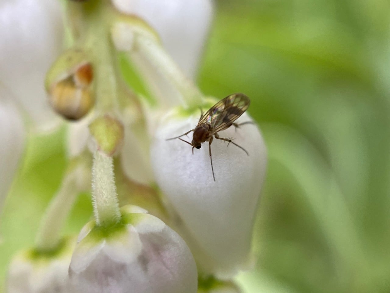 A small insect is perched motionless on a manzanita flower. It is a Fungus Gnat, genus Mycetophila (family Mycetophilidae).