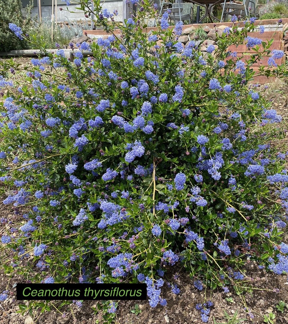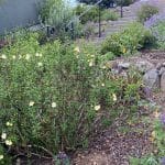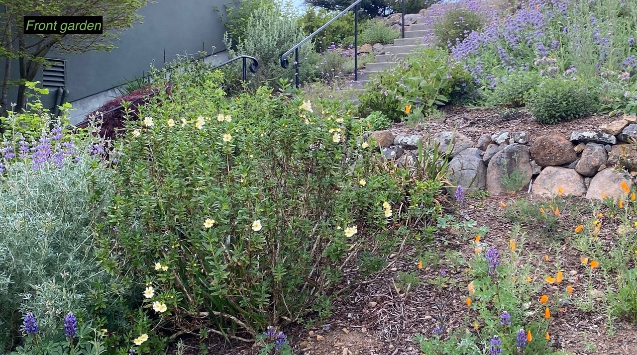 Keystone species—our own, local ecological powerhouse plants—in this garden include coast live oak, holly leaf cherry, pink flowering and chaparral currant, wild rose, huckleberry, California sunflower, California lilac, snowberry, serviceberry, aster, goldenrod, lupine, manzanita, sage, native strawberry, buckwheat, mountain mahogany, honeysuckle, elderberry, and penstemon.