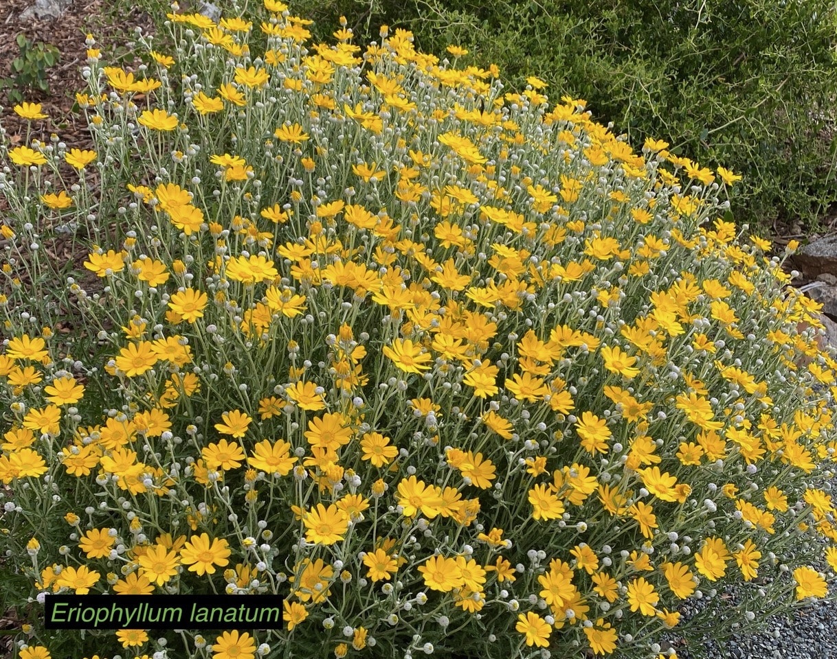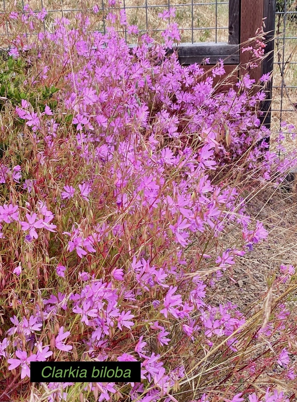 Flagstone and gravel paths lined with boulders and branches wend through the expansive back garden, past drifts of pink and cream flowering buckwheat. In spring the sunny and windswept slope is a sea of bright pink clarkias and lavender Phacelia that delight yellow-faced bees, which buzz happily from blossom to blossom collecting pollen and nectar. These blossoms are soon joined by lupins, penstemons, poppies, and more.