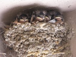 Hummingbirds, white-crowned sparrows, Western bluebirds, red-breasted nuthatches, hooded orioles, black phoebes, and oak titmice have been seen in the garden; barn swallows nest here every year. The birds are attracted by dried seed heads, which are left on the plants well after the blossoms are spent. Leaf litter and smaller prunings are left in place or added to small brush piles to support insects and provide shelter for small creatures. Once-annual winter pruning to refresh or reshape larger plants is used as erosion control mulch on a rear slope, where railroad vegetation-clearing and wildlife digging has foiled most attempts to establish plants.