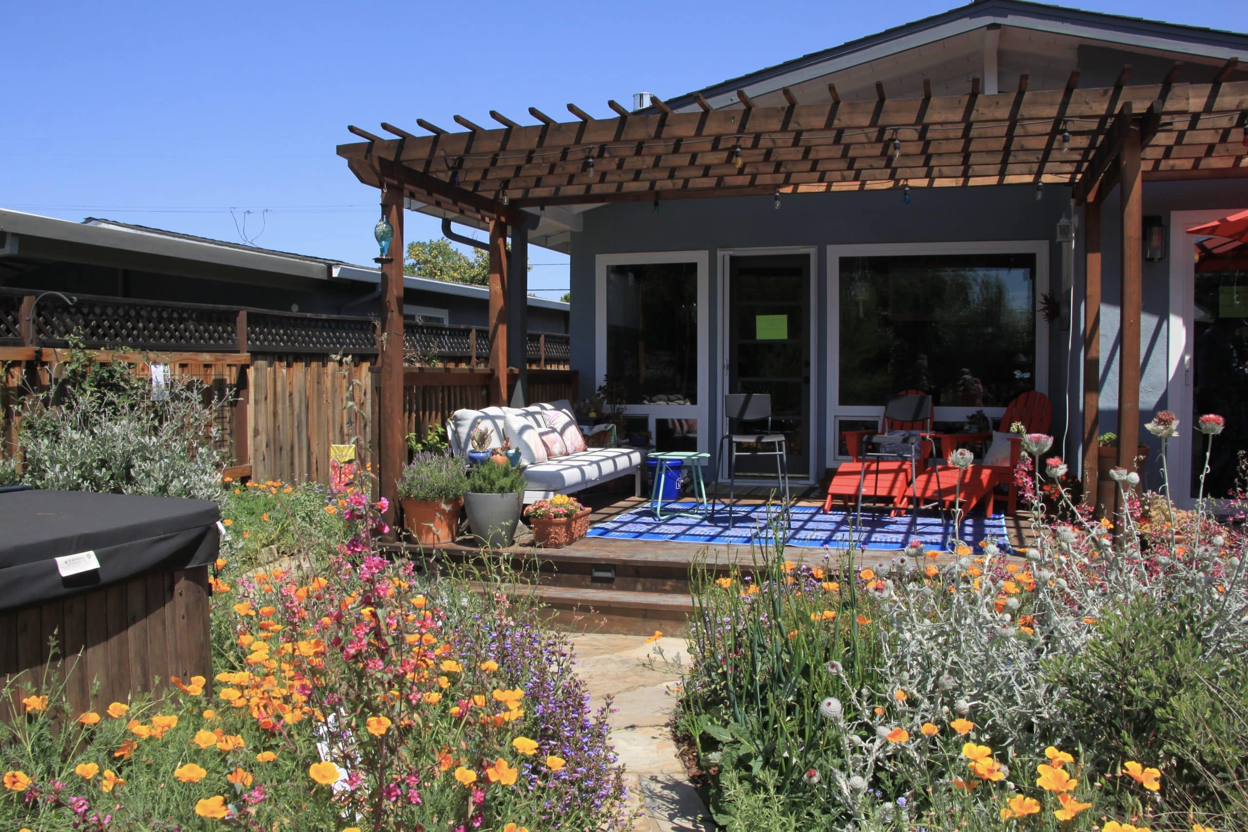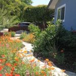 Their beautiful and inviting back garden includes heat-loving natives, such as several types of manzanitas, white sage, apricot mallow, and penstemons. Their front yard boasts flowering currants, as well as John Dourley manzanitas, mountain mahogany, toyon, and many native grasses.