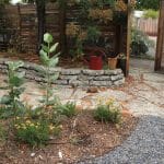 • The concrete from the back yard was used to make the driveway. The spacing between pieces of concrete allows rainwater to sink into the soil, thereby replenishing the aquifer and protecting the nearby creek from scouring. The backyard concrete (yes, there was a lot of it!) was also used to create the retaining walls that border the driveway and the raised beds and current patio in the back garden.