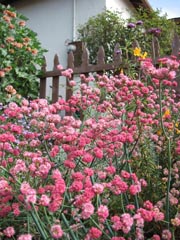 Showcase feature: Jesse, who lives down the street from Rick Goodwin (whose garden is also on the Tour), asked Rick to design and install a native plant garden for his corner lot. The result is a mulched path bordered by red fescue and blue-eyed grass, and surrounded by a sea of rosy pink buckwheat and a vibrant assortment of lupine, farewell-to-spring, poppies, lupine, and fuchsia. The Berkeley sedge, manzanita, and California lilac will stay green throughout the year.