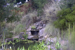 Gardening for Wildlife: The restful sound of falling water attracts both people and wildlife. After the pond was installed, Joseph delightedly noted that Pacific chorus frogs came in on their own. Bees, lizards, lots of butterflies, insects, and a variety of birds are also attracted to this garden.