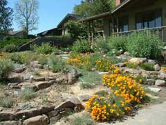Gardening for Wildlife: In addition to the local native plants, a brush pile provides shelter for wildlife, including a family of alligator lizards. Flocks of white- and golden-crowned sparrows are attracted to the grassland. Other birds include California towhees, mourning doves, juncos, goldfinches, warblers, nuthatches, chickadees, ravens, and an occasional hermit thrush. California fuschia and hummingbird sage attract hummingbirds. Bees are plentiful among the various flowering plants. The chirping of crickets fills the air in late summer evenings. Bats come out at dusk.