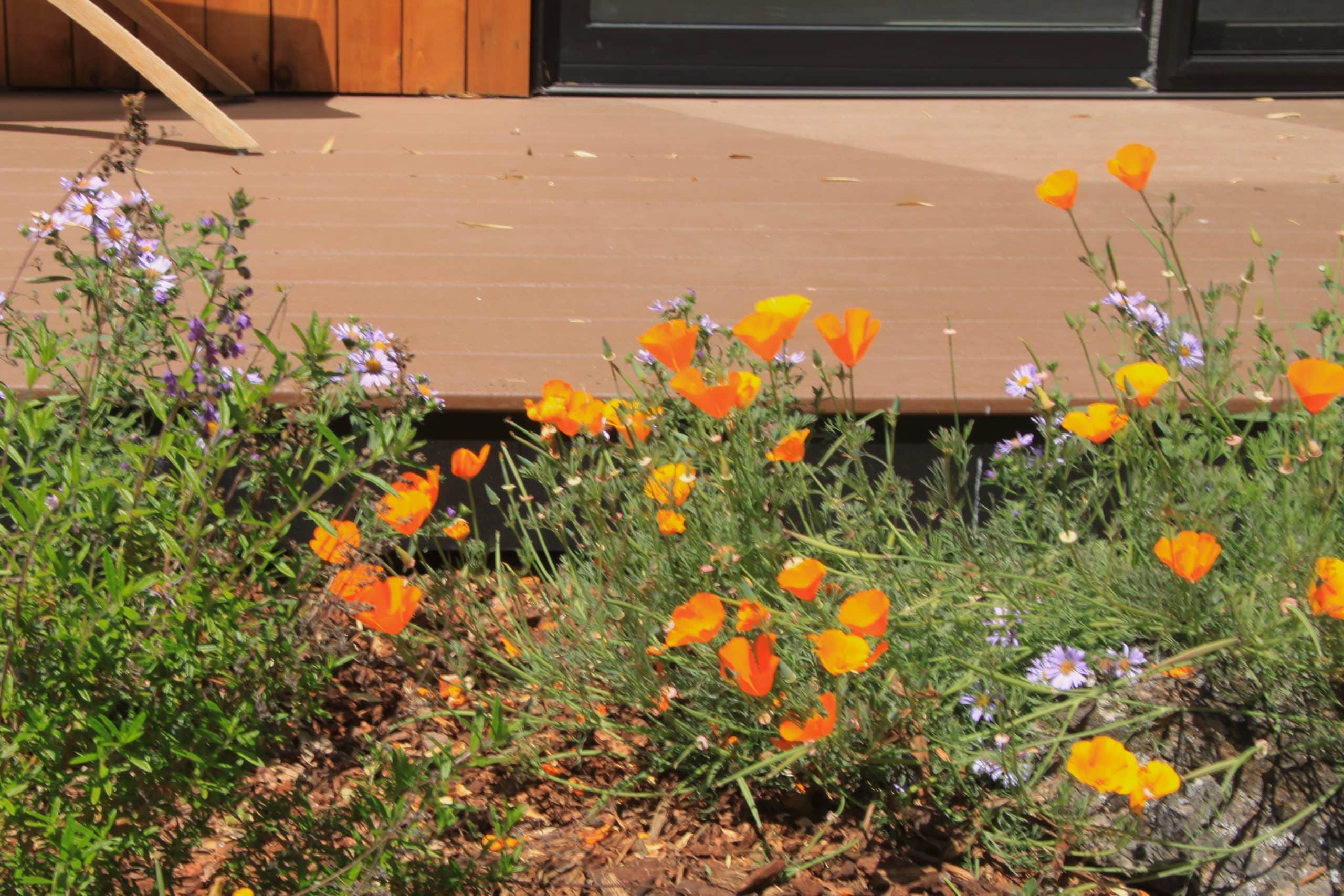 An attractive mix of orange poppies, red hummingbird sage and monkeyflower, yellow sulphur buckwheats, lavender verbena “De la Mina,” and purple Douglas iris brighten the garden in spring. Dutchman’s pipevine, the only plant the large, iridescent blue-black pipevine swallowtail butterfly can lay its eggs on, is growing up a trellis, as is virgin’s bower—making good use of every inch of space.