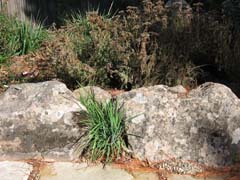 - Grading for a stone patio in the rear generated enough soil to build a berm near the busy, noisy road in front. The berm is topped with a fence of recycled grapestake and soon will be covered with screening shrubs, completing a transition from an exposed front yard to a secluded entry garden.