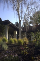 Gardening for Wildlife: A diversity of native plants (including a variety of native berry-bearing plants), three bird feeders, and a bird bath have created a haven for wildlife. The garden is now visited by goldfinches, pine siskins, titmice, and hummingbirds (which love the penstamen). White-crowned sparrows, which the gardener had never seen in the garden until the native plants were brought in, are a welcome sight. Hummingbirds and “jillions” of butterflies are also frequent visitors to this wildlife-friendly garden. Merry just installed barn owl and bat boxes. A dead birch was left as a snag; logs from the birch provide places for little creatures to live.