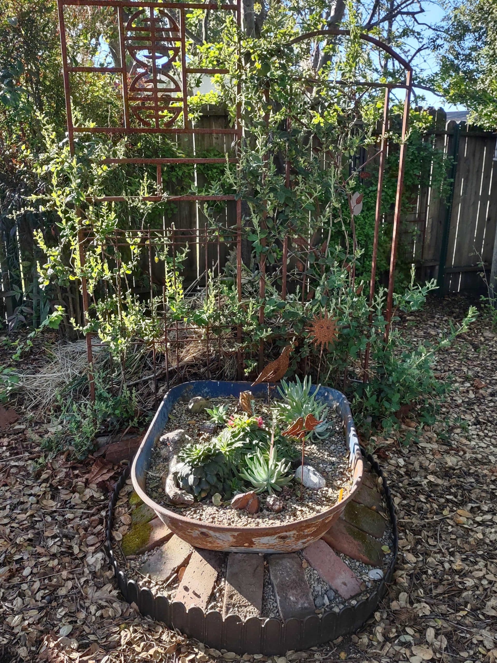A cheerful collection of garden art, including rustic metal birds, butterflies, and plants, wooden planter boxes and terra cotta pots, driftwood, and an extensive collection of whimsical (and functional) bird houses brighten the garden from ground to eye level.