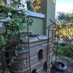 • Two compost piles from landscape waste create rich soil that is used in the raised veggie beds and around the fruit trees.