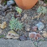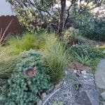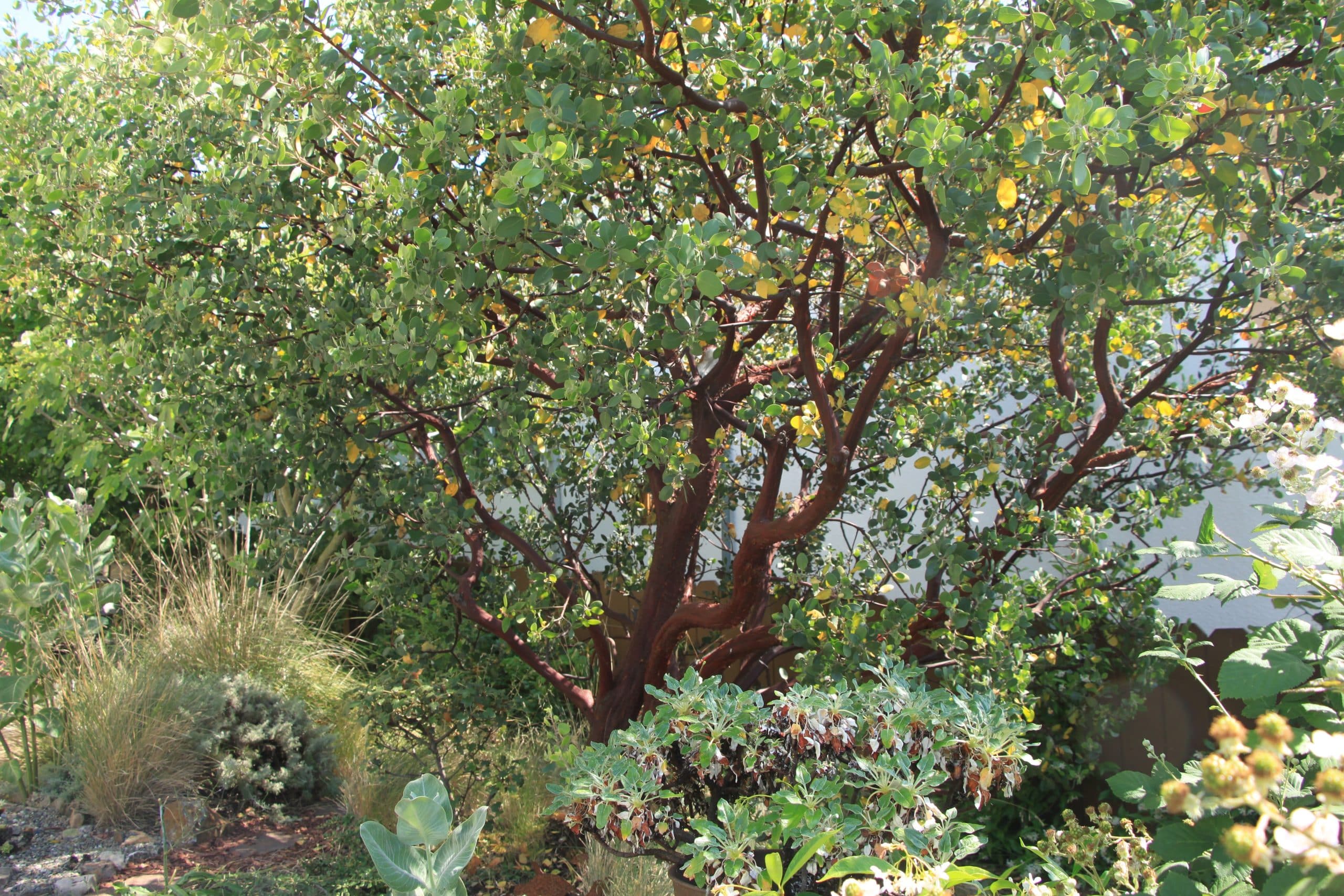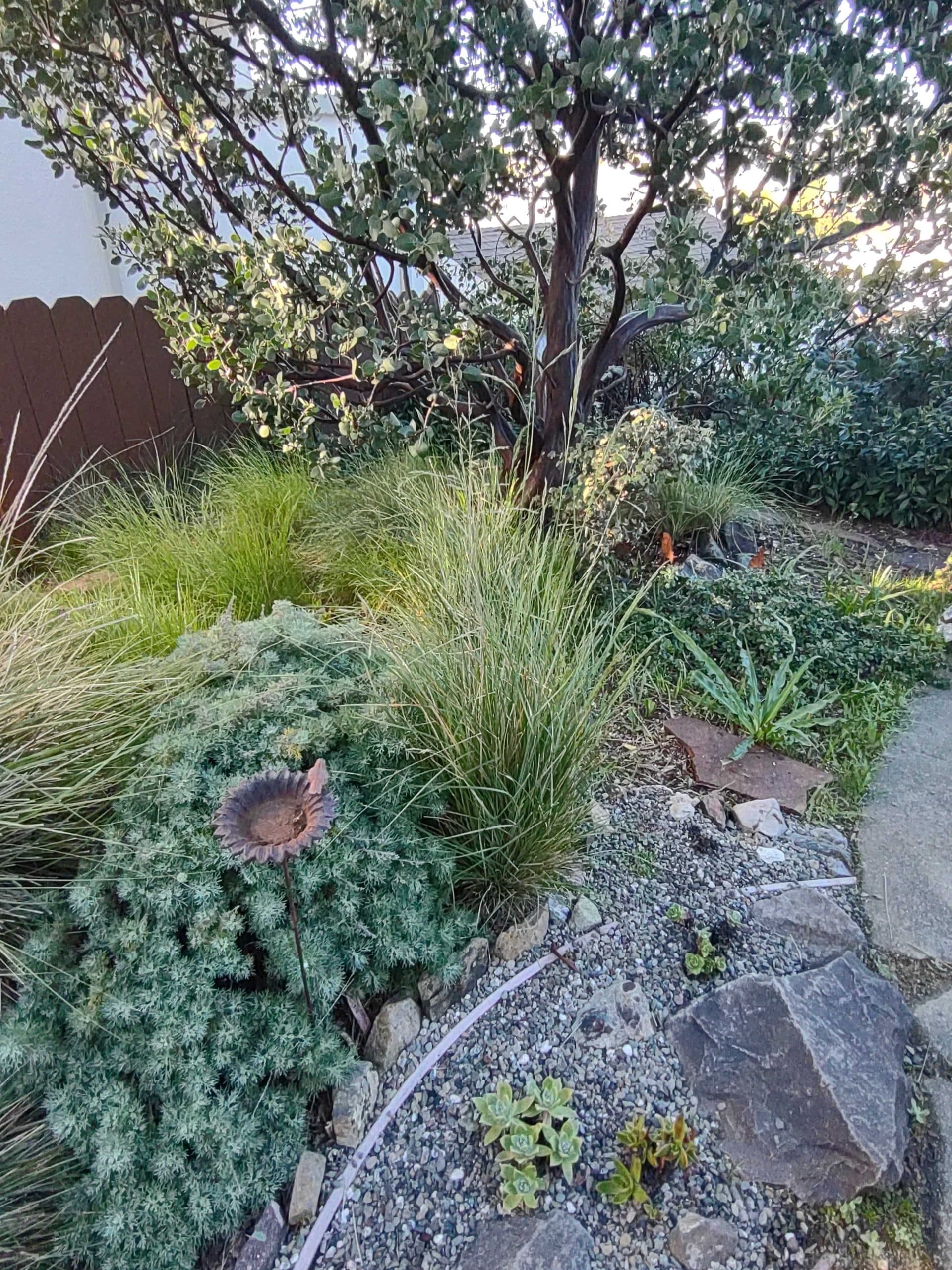 Every inch of space has been put to good use in this lush, inviting back yard. A collection of hardy trees and shrubs that are great for attracting wildlife (coast live oak, elderberry, California lilac, manzanitas, buckwheats, sage, and coyote brush) provide structure and greenery throughout the year, and an assortment of trellises create vertical growing areas, supporting native honeysuckle, grape, virgin’s bower, and our native morning glory. Don’t miss the majestic ‘Dr. Hurd’ manzanita that anchors the entrance to the garden.