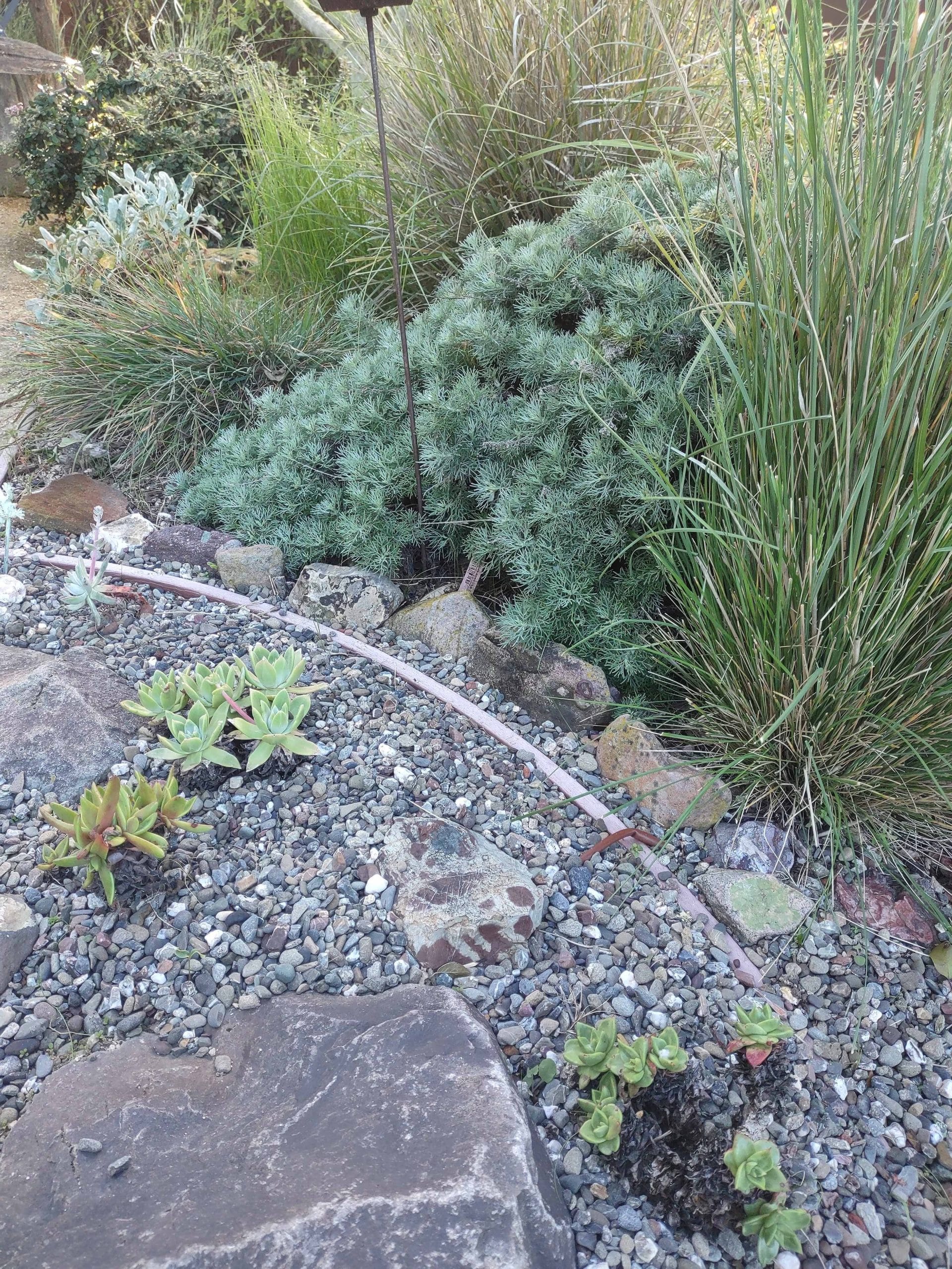 Keystone species—our own, local ecological powerhouse plants— in this garden include coast live oak, huckleberry, California lilac, pink flowering currant, chapparal currant, hazelnut, sage, snowberry, manzanita, elderberry, buckwheat, ocean spray, native honeysuckle, and penstemon.