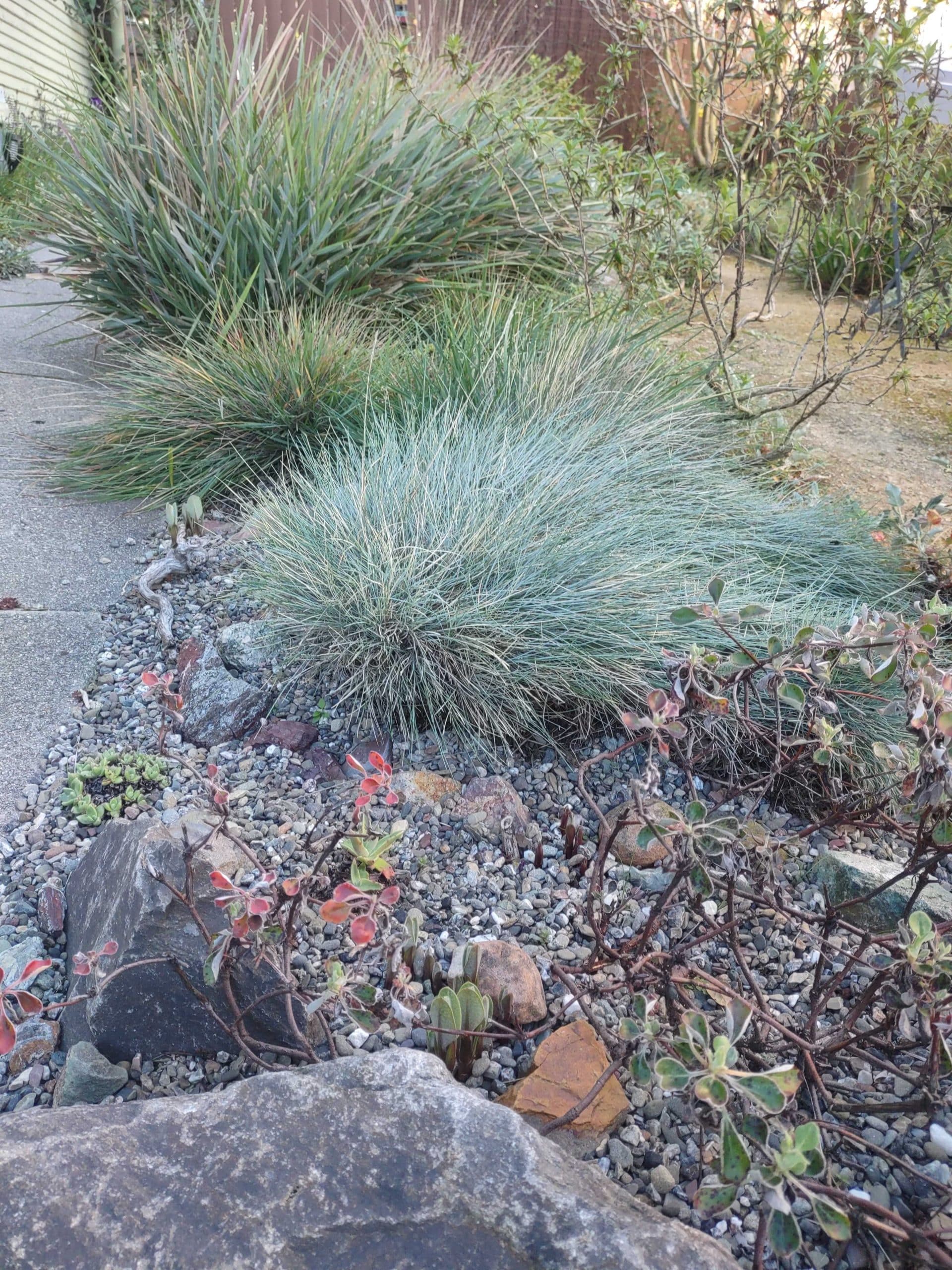 • A small native bunchgrass lawn (bent grass, or Agrostis pallens) serves as a play area.