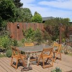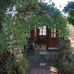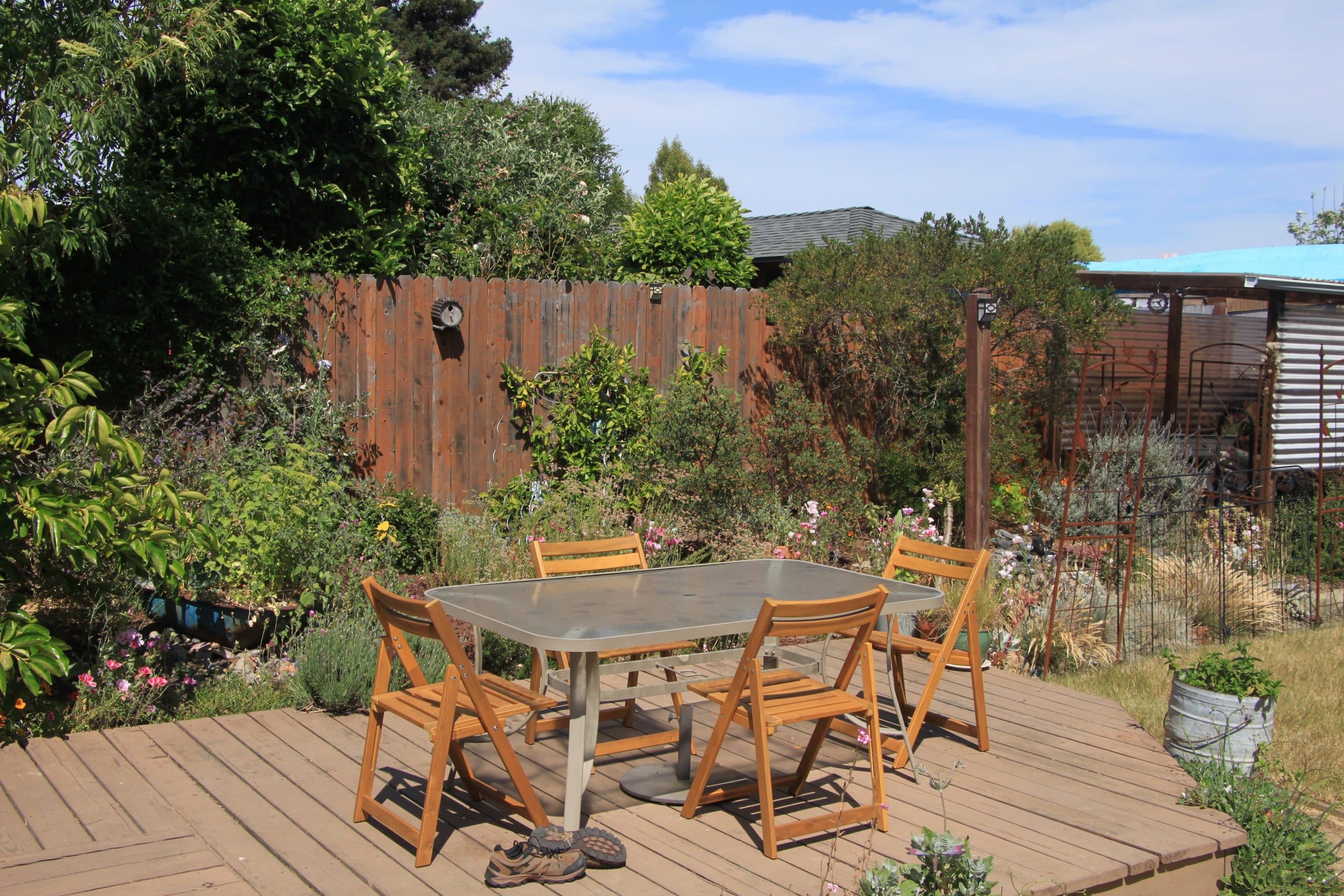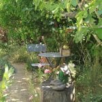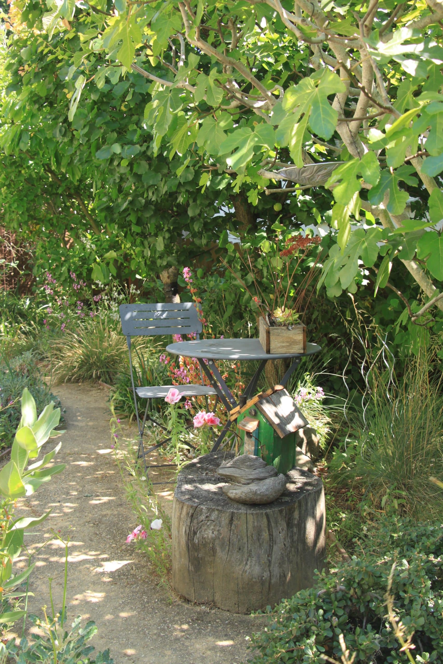 • A row of fruit trees (pear, apricot, cherry, fig and apple) shade a cafe table and two chairs. Take a seat in this cool spot and rest a while! Other fruit trees include persimmon, tangerine, lemon, pineapple guava, strawberry tree, and plums.