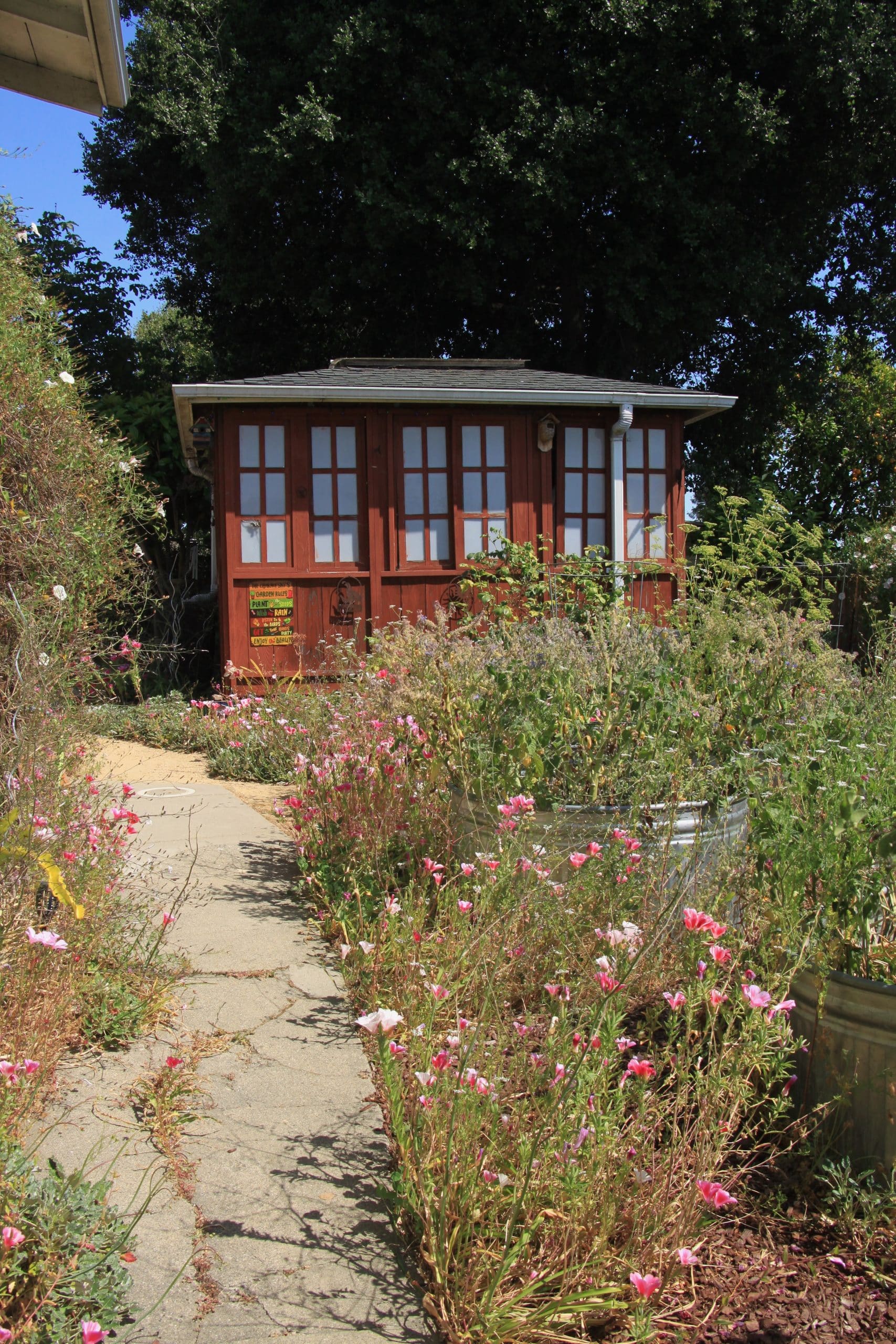 A gang of rambunctious natives fills in empty spaces: bright pink clarkias and red rosy buckwheats pop up in sidewalk cracks; soaproot, delighting native bees and moths with its lovely twilight-opening white blossoms, takes hold in sunny spots. Douglas iris have gracefully filled in large shaded areas, and Dutchman’s pipevine clambers up and sprawls across other shady locations. This team of hardy natives mingles with a plethora of other plants, including a colorful variety of wildflowers, such as yellow lupine, purple gilia, orange poppies, and blue-eyed grass, as well as edibles which may have started out in the raised beds, but wind up being left to grow where they are happiest.