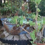 • Found materials enjoy new lives in this garden: mattress springs function as trellises, and repurposed old wheelbarrows are now charming raised garden beds.