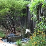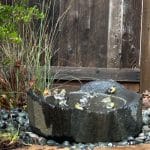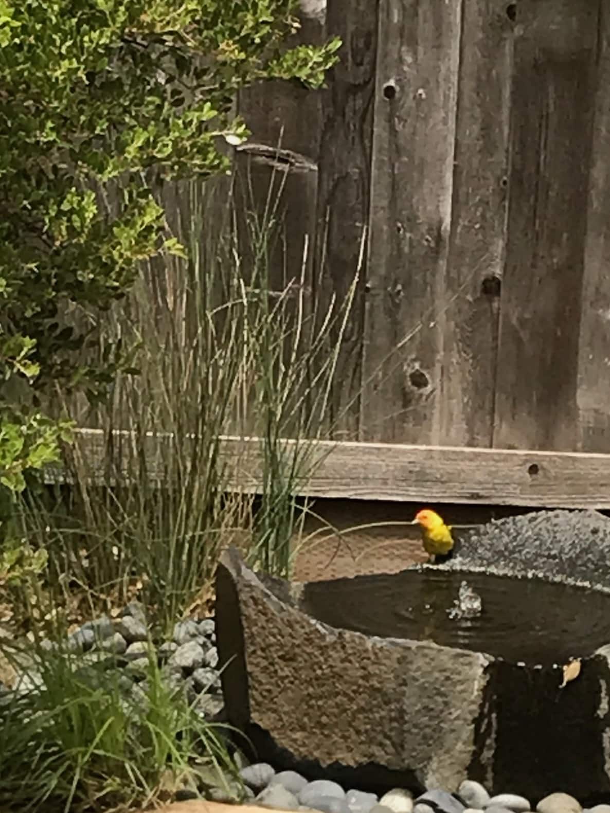 ⢠Basalt bird bath burbles pleasantly near the seating area, attracting people and feathered visitors alike.