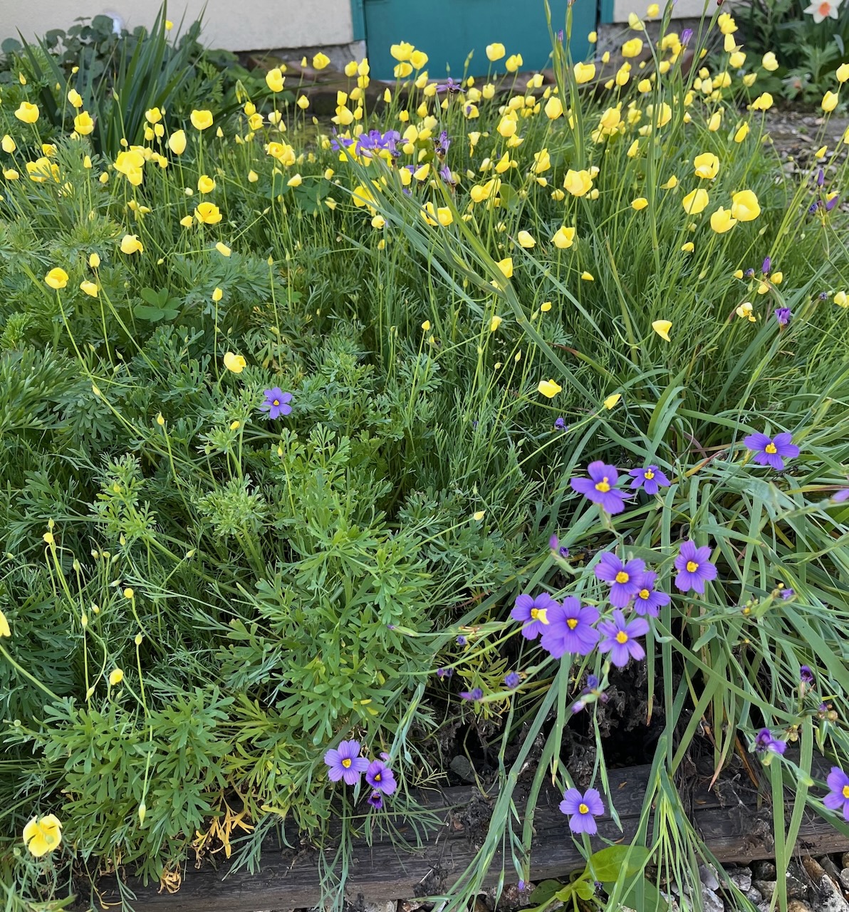A buckeye and a large St. Helena manzanita grow out of (and into!) massed moss rock boulders. A mini soap root forest flourishes near the manzanita: Nora said she ”Loves soaproot: their wavy leaves, the drama of their height, and it’s so romantic that they bloom in the evening.”