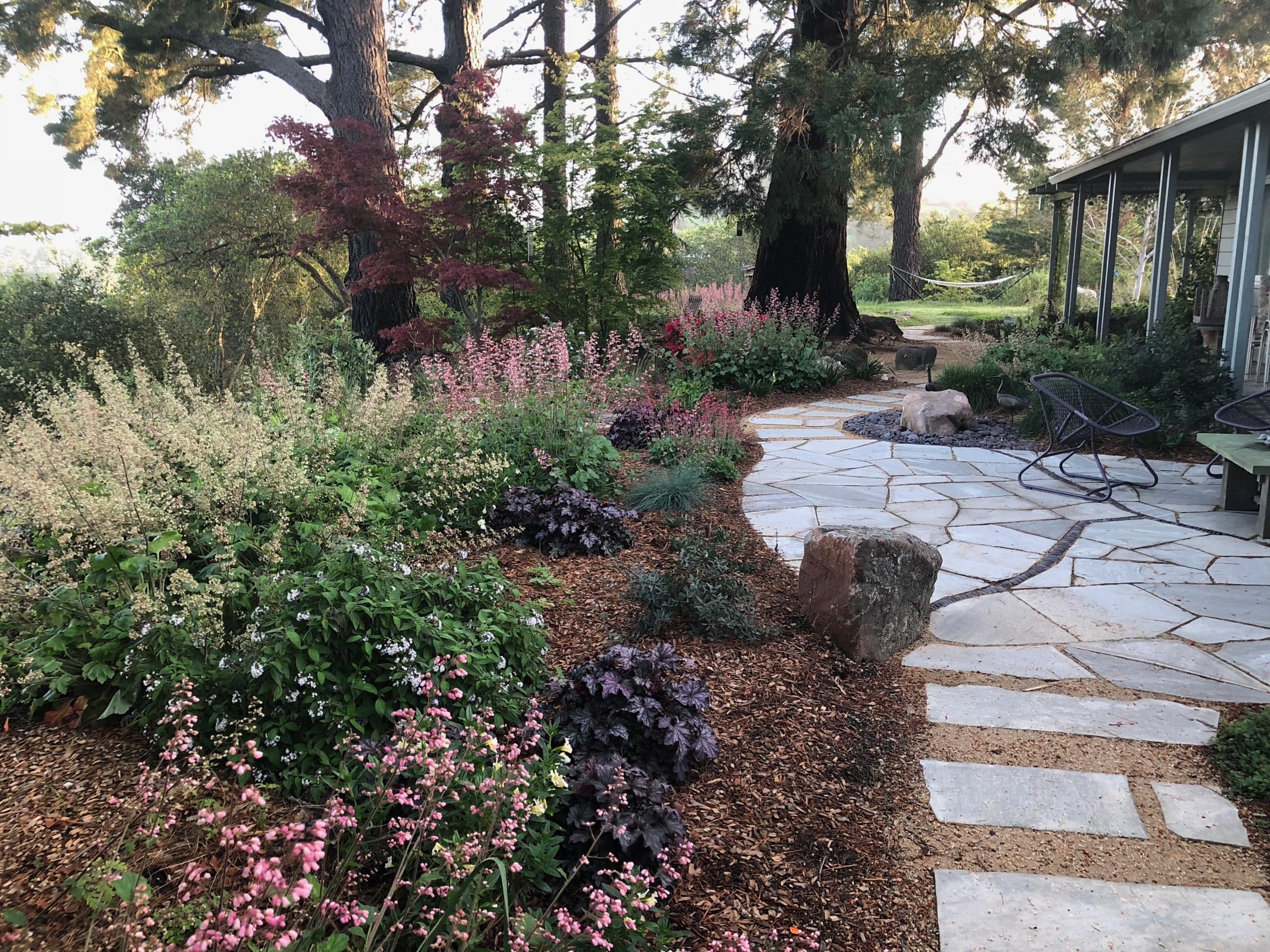 Keystone species—our own, local ecological powerhouse plants— in this garden include coast live oak, currant, manzanita, buckwheat, lupine, coffeeberry, sage, and penstemon.