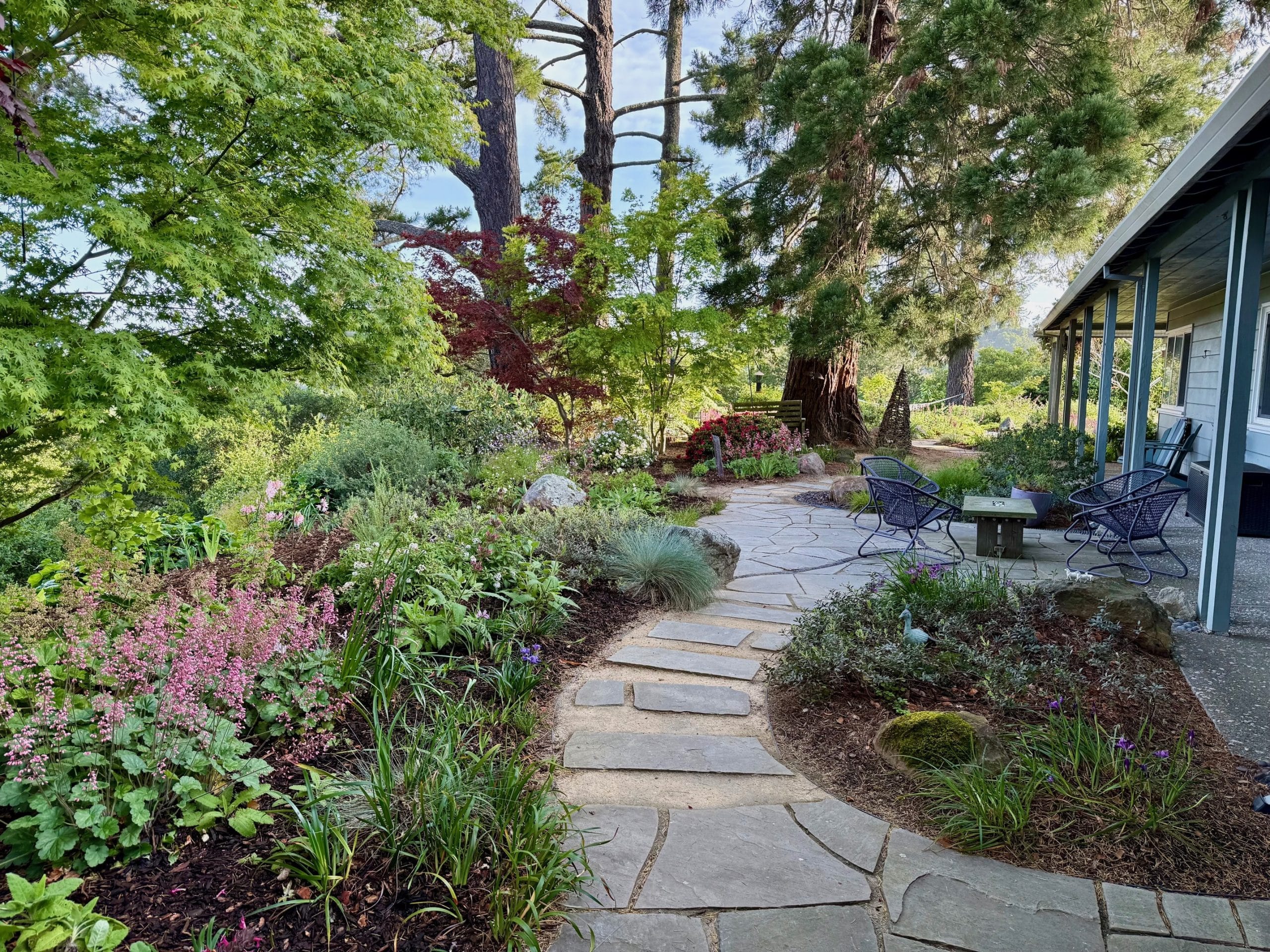 - Comfortable Adirondack chairs invite you to take a rest and enjoy the garden—please do!