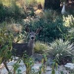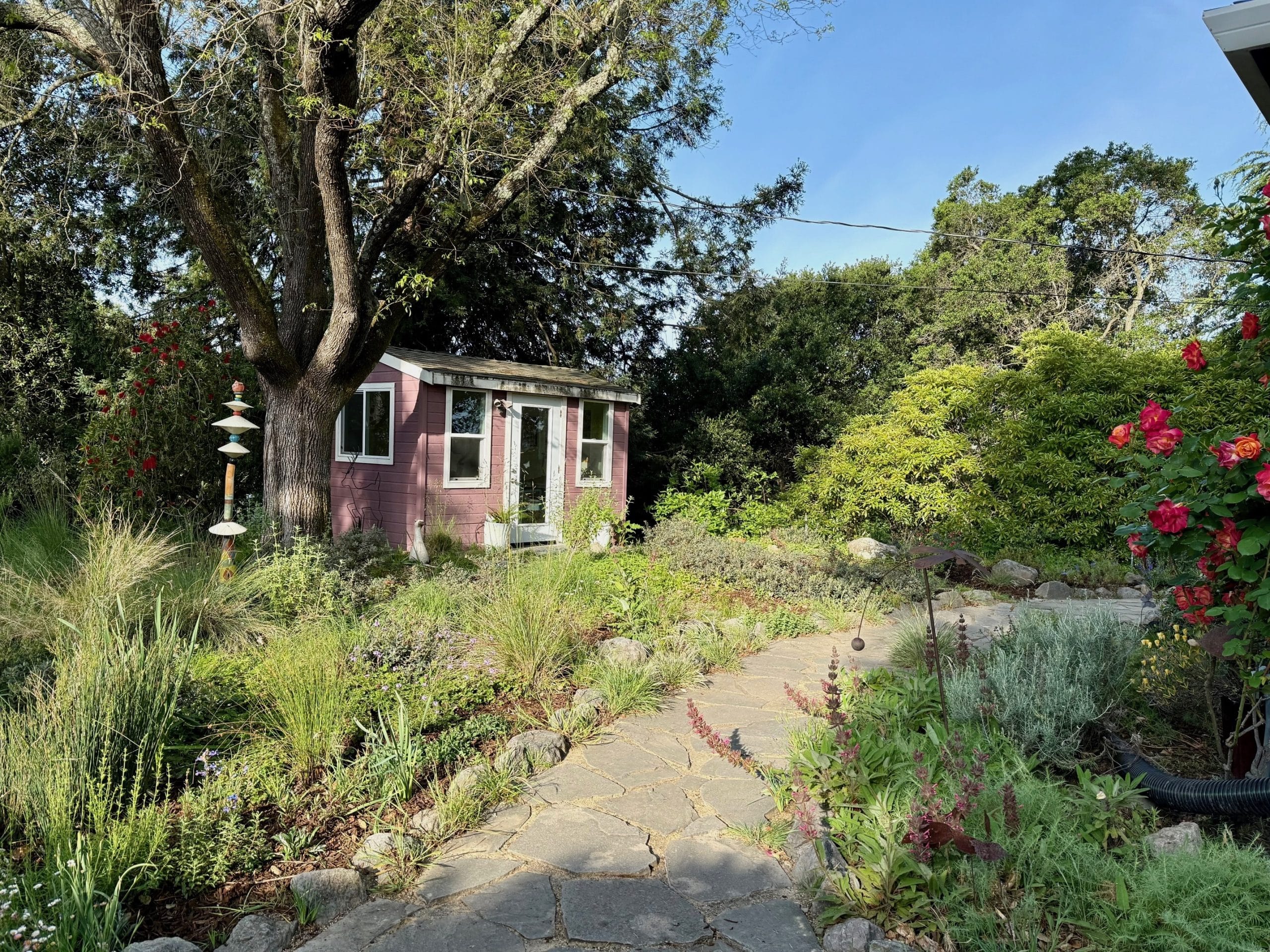 Quail parents and their dozen adorable chicks forage for seeds among the grasses in the front garden. More than fifty species of birds, including four species of woodpeckers, as well as flickers, are drawn to Pat and Glenn’s garden by the water, seeds, and nectar, and the feeders (suet, mealworm, and Niger seed). In order to protect birds, the family cat is kept indoors.
