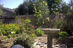 Gardening for Wildlife: A haven for winged creatures, this garden attracts cedar waxwings, flickers, orioles, finches, hummingbirds, towees, and red-tailed hawks in addition to butterflies, bees, and other beneficial insects. Monarch butterflies lay their eggs on the milkweed, and tie their chrysalis’ to the fence. In the back garden, a drip-fed bird bath provides water; birds adore the tall shrubs and plethora of berries. Hummingbirds and beneficial insects love the five kinds of sage.