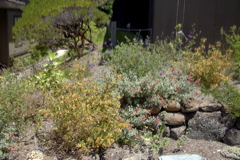 Gardening for Wildlife: Hummingbirds, native bees, and butterflies flit, flutter, and buzz the native plants, happily nectaring and collecting pollen. (While pointedly ignoring the ivy.) Leaf cutter bees build tunnels in the ground under the natives, and carry circles of leaves across the garden. Bumblebees visit the clarkias, and other native bees visit the bee plant, toyon, and Mariposa lilies. Hoverflies more like UFOs between the flowers. Hummingbirds are attracted to the sticky monkeyflower, penstemon, and sage.