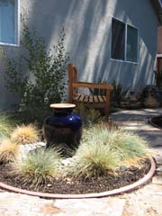 Gardening for Wildlife: Large boulders are havens for lizards. The sound of water falling into the urn fountain attracts birds, as does the bird bath and the feeders. Hummingbirds are attracted to the bright tubular flowers of the native fuchsia and monkeyflower. Owls and hawks hang out above the garden.