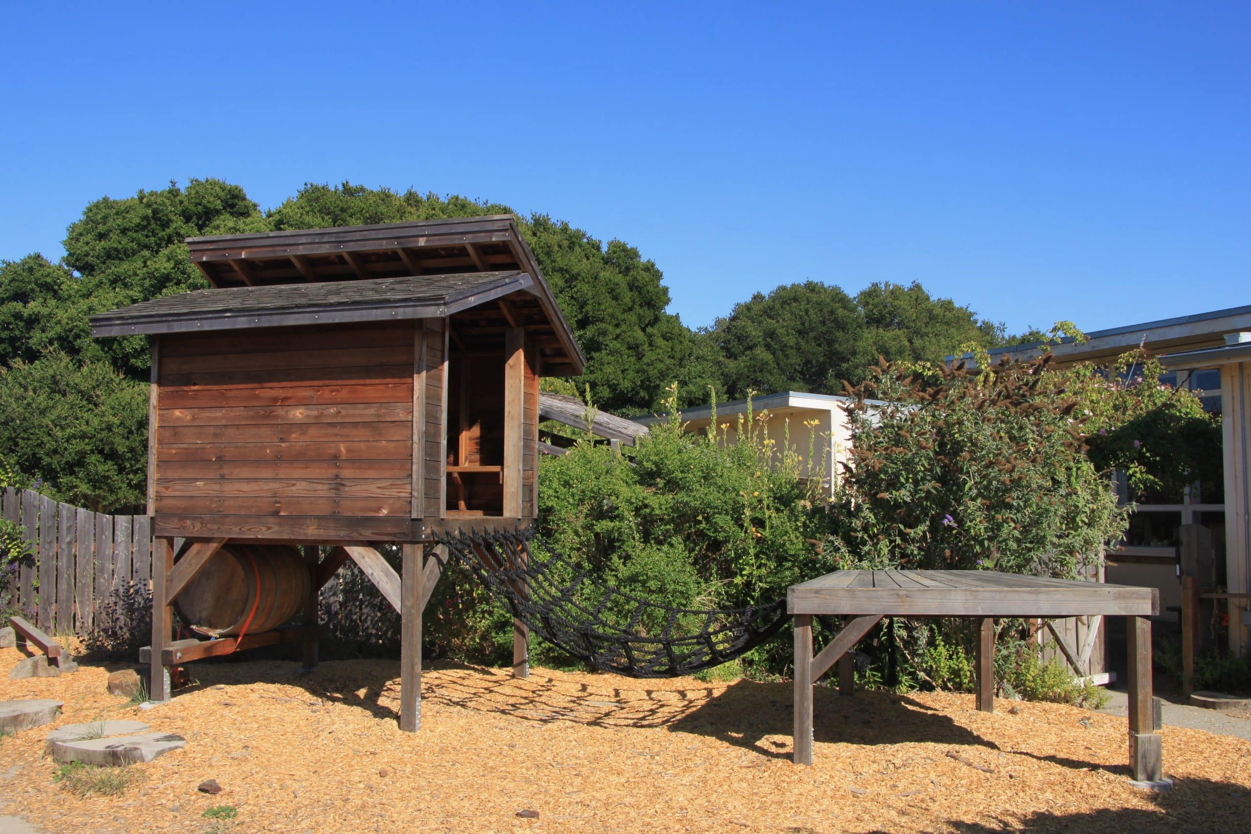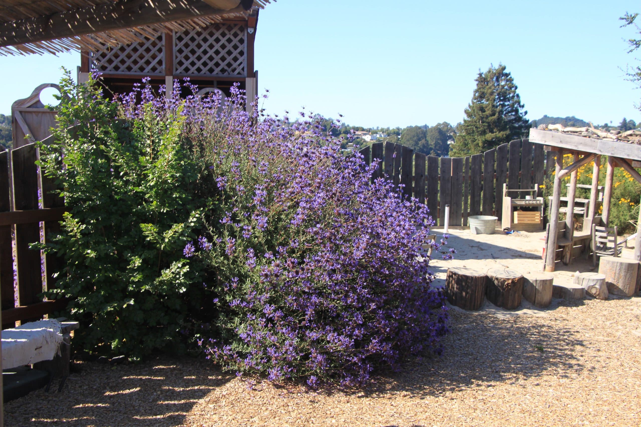 Picture a cottage with a living roof, an arched wooden bridge, and a pint-size climbing slope (not steep enough to be called a wall, but it’s the same idea), along with a sail-cloth shade structure that shelters a Dutchman’s pipevine corridor crafted from wooden tree stakes and bamboo—all of them surrounded by a variety of alluring native plants, and kept cozy by a cheerful, wrap-around wave-motif fence. Shading the gardens are numerous coast live oaks, and softening the lines of the play areas are a plethora of manzanitas, sages, buckwheats, coyote brush, monkeyflowers, and more.